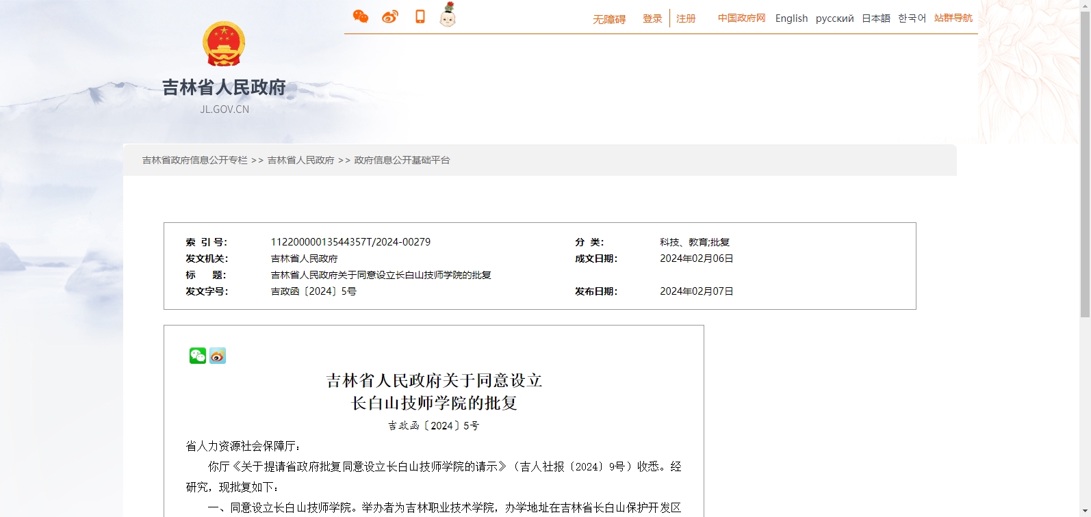 吉林省人民政府關(guān)于同意設(shè)立長白山技師學(xué)院的批復(fù)